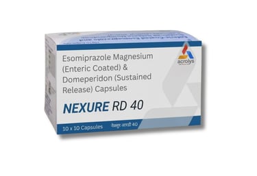 Nexure RD 40 Capsules is a combination of Esomeprazole Magnesium (Enteric Coated) and Domperidone (Sustained Release), formulated to provide effective management of acid-related gastrointestinal disorders associated with delayed gastric emptying.